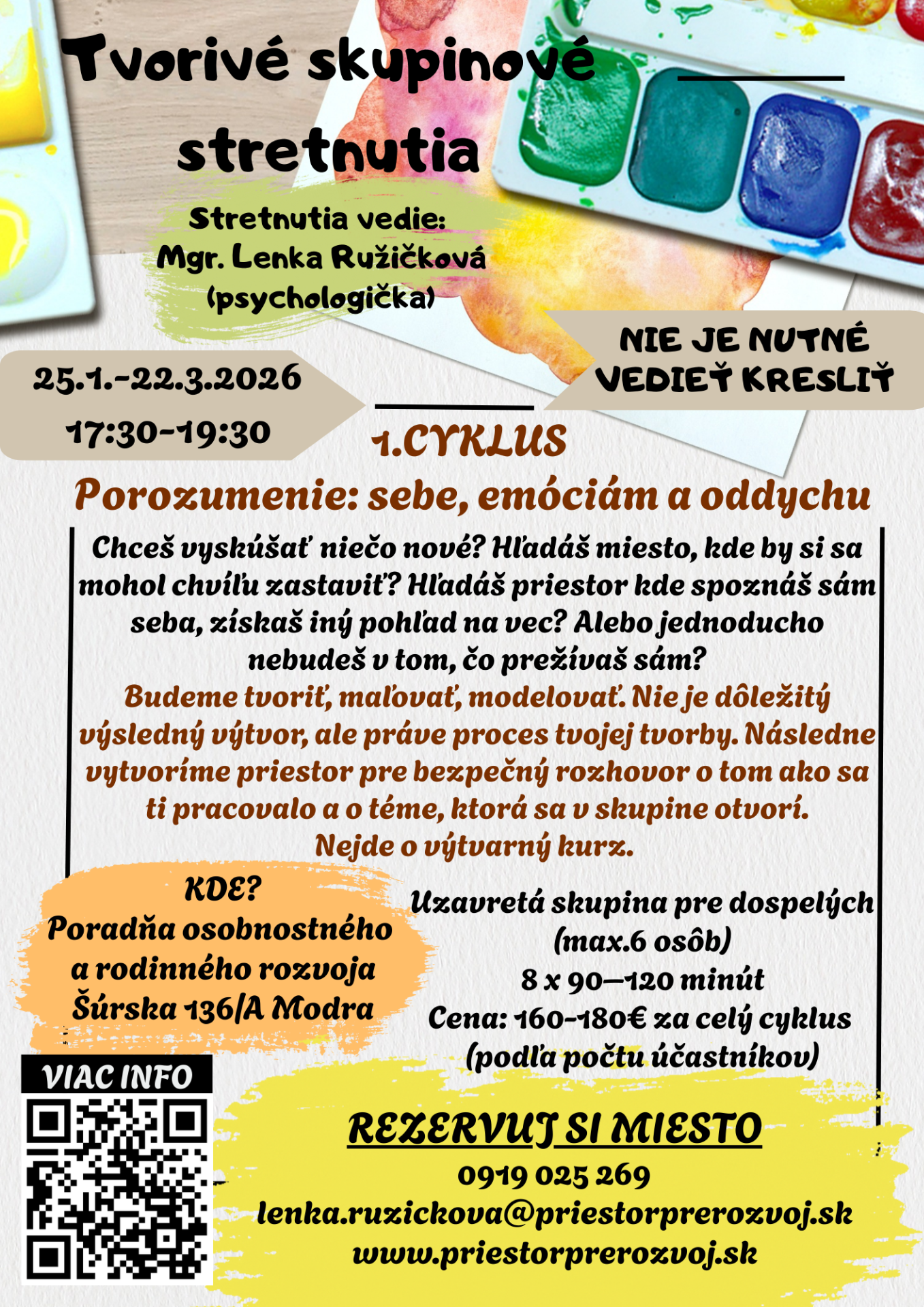 V bezpečnom a podpornom prostredí sa budeme venovať tomu, ako prežívame emócie, čo nás zaťažuje a čo nám pomáha cítiť sa pokojnejšie.